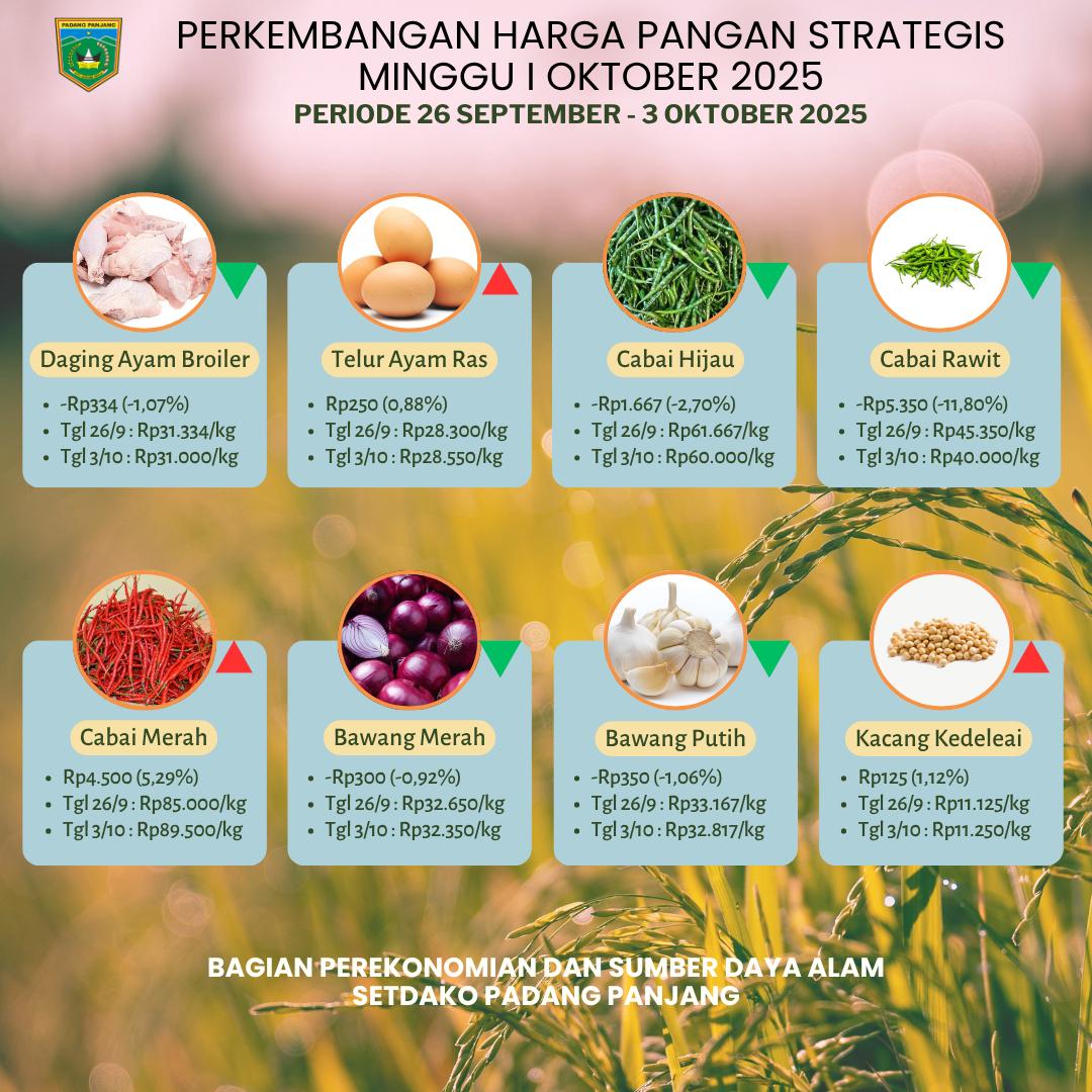 Laporan Padang Panjang- Kabar gembira bagi perekonomian rumah tangga di Kota Padang Panjang. Memasuki pekan pertama Oktober 2025, harga sejumlah komoditas pangan strategis kembali menunjukkan tren penurunan yang signifikan. Pemantauan aktif yang dilakukan oleh Dinas Perdagangan dan Dinas Pertanian setempat mencatat, setidaknya ada 10 bahan pokok yang harganya mengalami penurunan, dengan bawang merah sebagai bintangnya yang konsisten turun selama lima pekan berturut-turut.